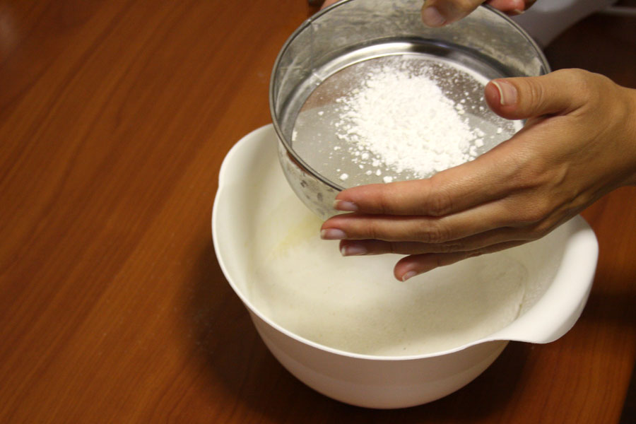 3. Setaccia la farina di riso e il lievito nella ciotola dei tuorli.