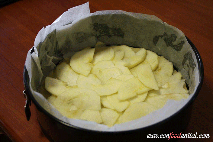 - In una teglia di diametro 18 cm versa un primo strato d’impasto, poi disponi le mele; procedi con un secondo strato e termina con un altro strato di mele. Infine, usa qualche mirtillo per decorare la superficie.