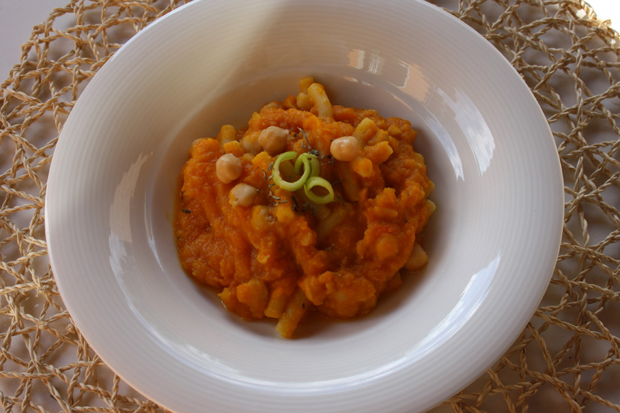 6. A questo punto regola di sale e pepe se necessario. Io ho aggiunto pasta di grano duro fatta cuocere a parte, ma la vellutata di zucca e ceci può essere gustata anche da sola o con qualche crostino di pane.